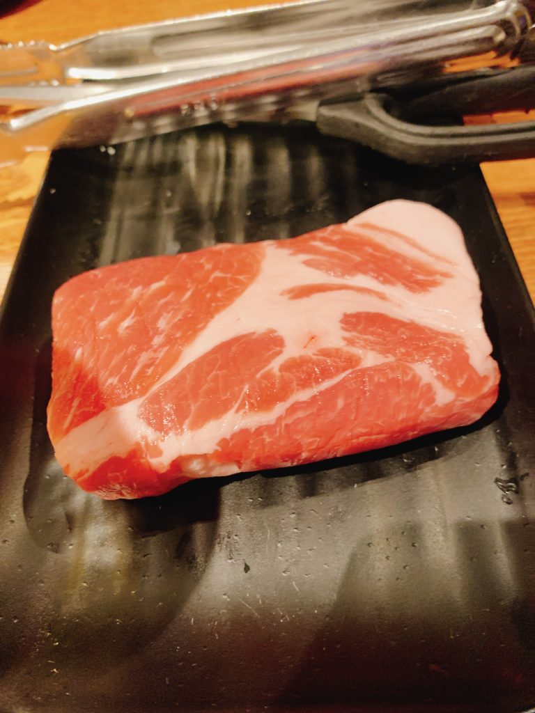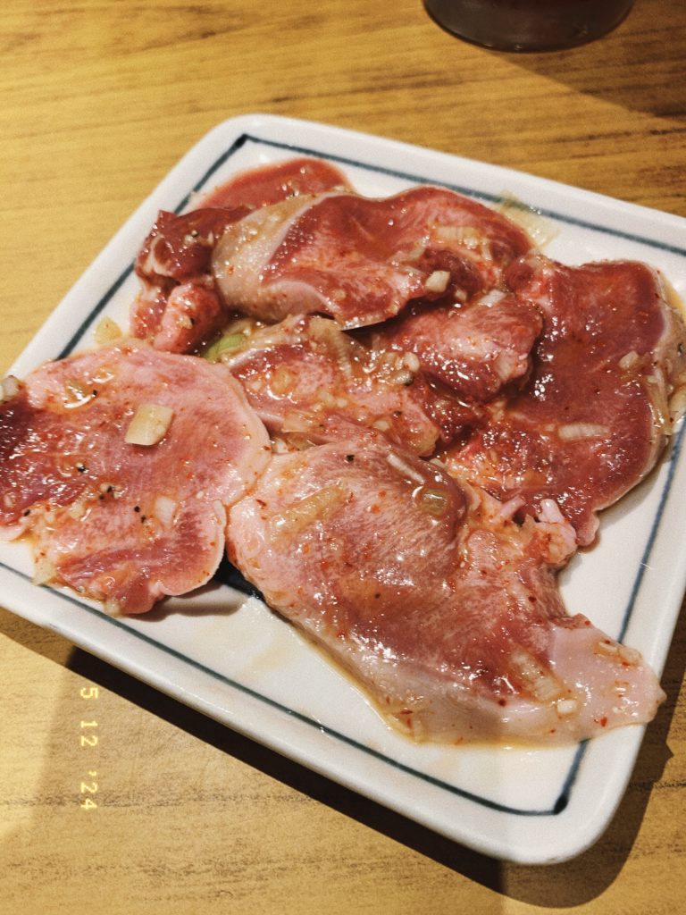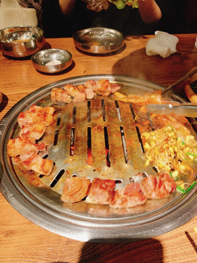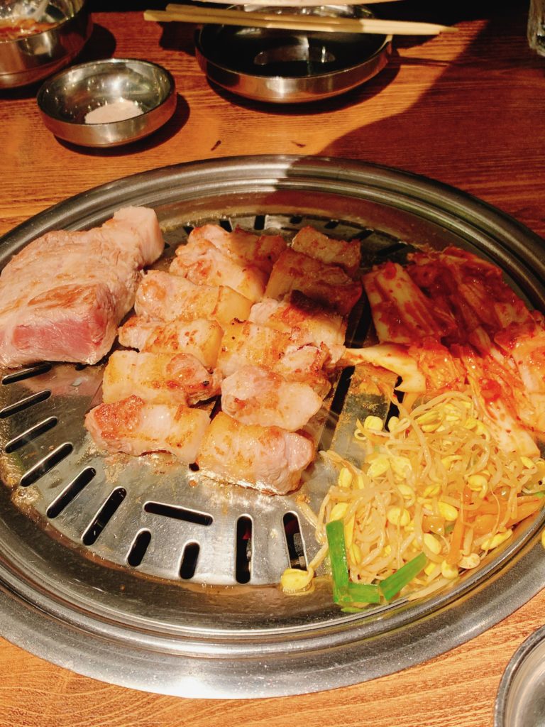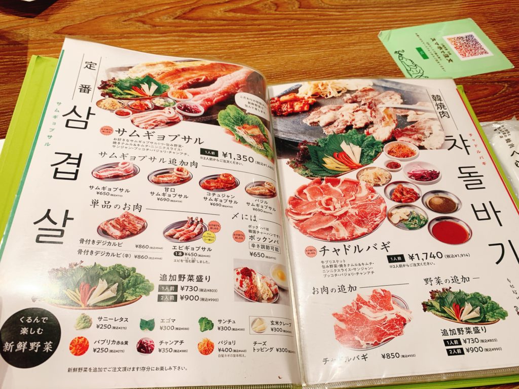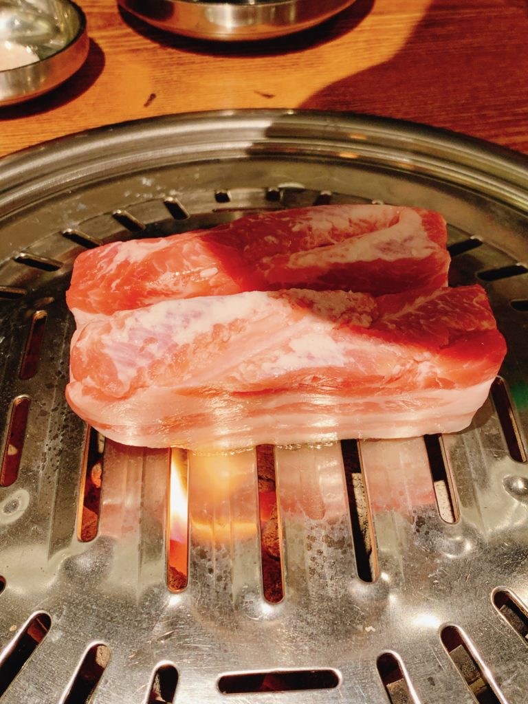 メニューを見ると、サムギョプサルや肩ロース、テジカルビなど様々な種類のお肉があり、迷ってしまいましたが、サムギョプサルとテジカルビを注文しました。お肉はスタッフさんが炭火で焼いてくれるので、自分たちで焼く手間が省けて楽チンでした。