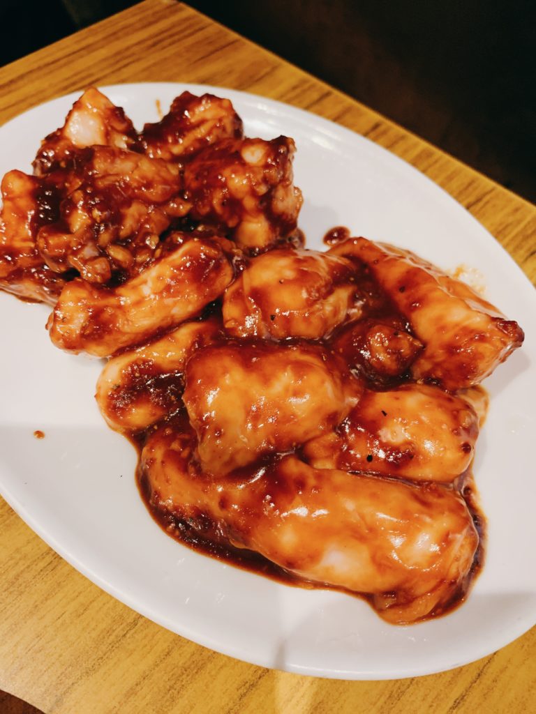 このお店の特徴は、サムギョプサルのように、焼いたお肉をエゴマやサンチュなどの野菜で包んで食べるスタイル。写真のお肉はジューシーで、香ばしく焼かれた豚肉を甘辛い特製のタレとともに、野菜で包んで食べることで、脂っこさを感じさせずにさっぱりといただけます。にんにくや青唐辛子も一緒に包んで、ピリッとしたアクセントを楽しむこともできます。