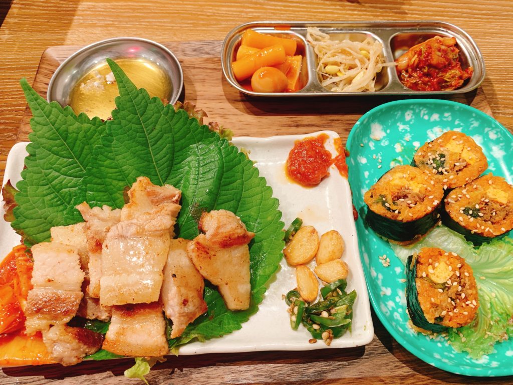 さらに、彩り鮮やかなキンパ(韓国風の海苔巻き)も絶品で、ごまの風味が効いたご飯と具材がしっかりと巻かれ、食べごたえがありながらも軽やかな味わいが特徴です。