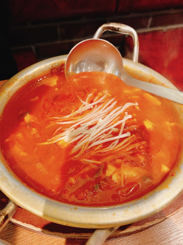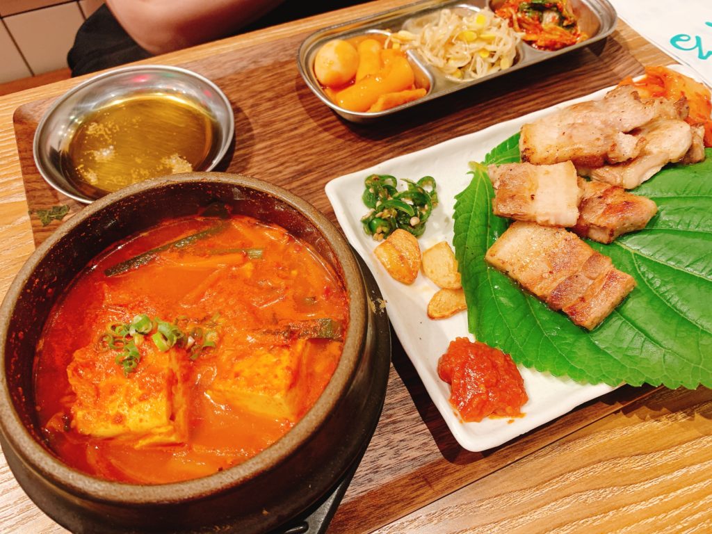 また、キムチやナムルなどの韓国風の小鉢がセットで付いており、バラエティ豊かな味わいが楽しめます。特に、濃厚でピリ辛のキムチチゲは、しっかりと煮込まれた豆腐と野菜がスープに溶け込み、体の芯から温まる美味しさです。
