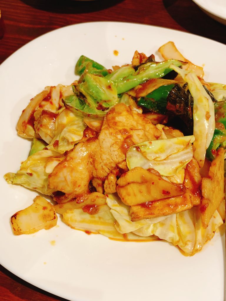 写真の料理は、まず「豚肉とキャベツのピリ辛炒め」です。シャキシャキのキャベツとジューシーな豚肉が甘辛いソースで絡められており、食欲をそそる一品です。キャベツの爽やかな食感と豚肉の旨みが絶妙なバランスを保っていて、ご飯との相性も抜群です。