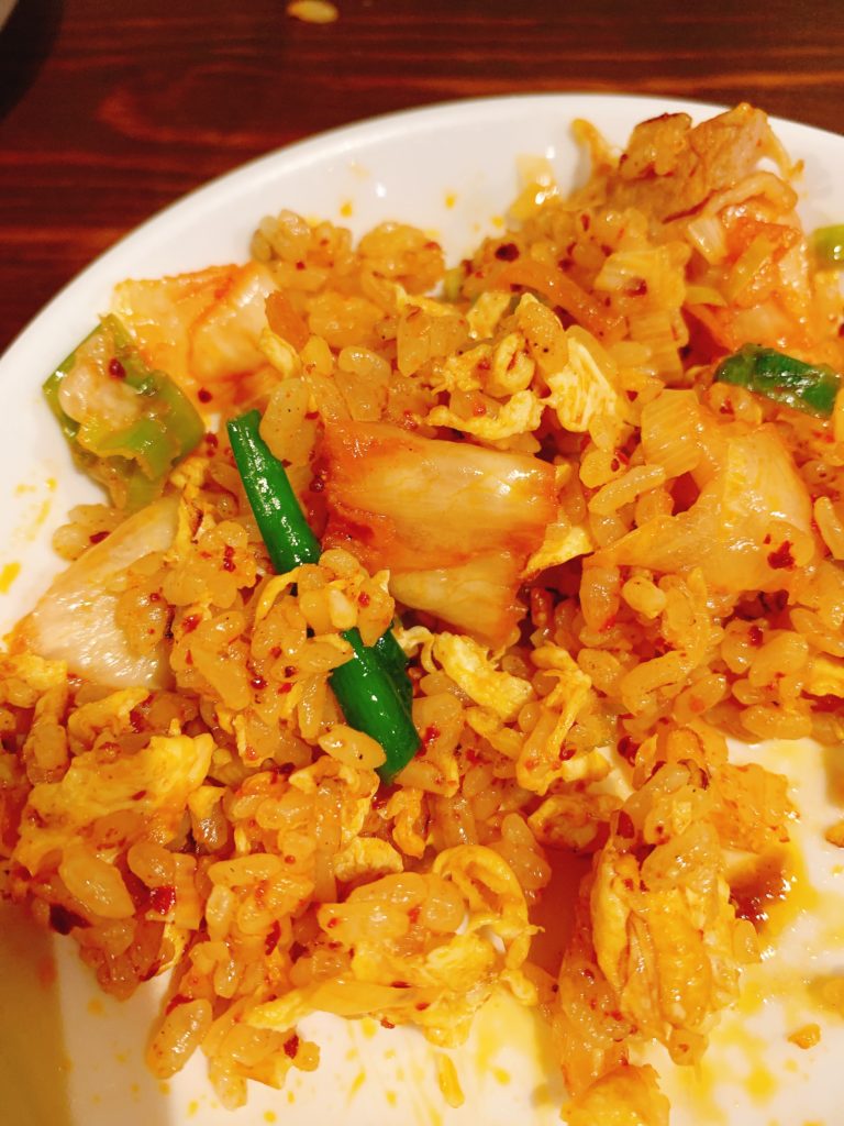 次に、もう一品の「キムチチャーハン」は、辛さが程よく効いた食べやすい一皿です。ごま油の香ばしさが漂い、キムチの酸味と辛味がご飯にしっかりと絡んでいます。卵のまろやかさが全体の味を引き締め、箸が止まらなくなる味わいです。
